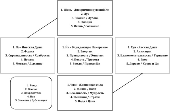 Шэнь, в данном случае, – это качество различающего знания, Хун – ян-душа, Чжи – воля, По – инь-душа, а Йи – структурирующий интеллект. В то время как для практиков Буддадхаммы достаточно работать только с качеством знания, чтобы низвергать каммические излияния, даоизм, который никогда не был чисто монашеской традицией, рассматривает развитие и созревание всех пяти духов. Таким образом, шэнь развивается параллельно с работой над телом и энергетикой. Поскольку процесс психофизического развития в даоизме включает в себя множество нюансов, я рассмотрю его кратко в текущей главе и более подробно во второй части этой книги. Пока же давайте рассмотрим теорию приобретенного «я».