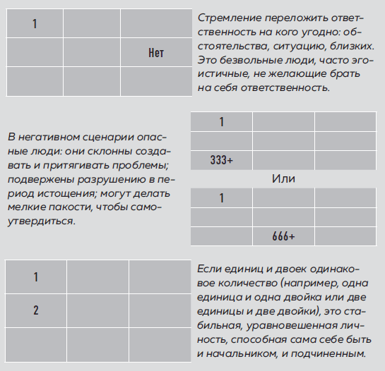 1 – одна единицаОчень противоречивый характер: люди с одной единицей упрямы и стремятся занять лидерские позиции, но в то же время им не хватает для этого силы воли, сложно принимать решения. Поэтому энергия таких людей часто уходит на создание антуража, свойственного лидерам, а за фасадом скрыта нерешительность, мягкость, даже отчаяние из-за несоответствия реальности своим же ожиданиям. Чтобы доказать свою значимость, они демонстрируют нарочитую грубость, авторитарность, сопротивляются любым мнениям, отличающимся от их взгляда на ситуацию. Они могут специально выступать в роли антагониста, чтобы создать видимость своей власти и значимости. Женщине с таким типом характера проще, ведь внешняя недоступность нередко добавляет очков: ее внимания будут добиваться, что льстит самолюбию. Мужчинам же с одной единицей может не хватать уверенности, поскольку быть лидером и казаться им – отнюдь не одно и то же.