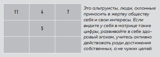 Друзья, не бывает плохих психоматриц! Любая матрица уникальна. В любой матрице есть свои нюансы, и только от вас зависит, реализуете вы их или нет. Даже пустые сектора дают плюсы, а определенные сочетания тех или иных неудачных, на первый взгляд, ячеек могут указывать на уникальный потенциал. Поэтому очень прошу: не делайте поспешных выводов о своих «плохих» чертах характера или «неудачной» судьбе. Прочтите книгу до конца (а может быть, и пару раз), разберитесь во всех сочетаниях, и вы поймете, как вам повезло родиться именно в этот день.