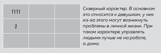 Настоящий лидерский характер со всем сопутствующим: настойчивостью, уверенностью, способностью вести за собой. При этом четное количество единиц позволяет таким людям быть действительно хорошими начальниками, руководителями: они могут выслушать чужое мнение, заботятся о своих подчиненных и не обидят их, просто чтобы доказать свою власть. В этом обычно и нет необходимости, другие сами признают их авторитет и позволяют управлять собой. Женщине важно управлять на работе, а не дома, тогда идиллия в семье возможна. У меня, например, показатель 1111 и 8 в матрице – работаю руководителем много лет, несмотря на то что матрица трансформировалась. Это хороший показатель для мужчин, так как характер с четырьмя единицами способен управлять, справляться с любыми сложностями, особенно при наличии энергии. Единственное, не забывайте слушать еще и других, а не только себя. И помните, что лишь нежелание (или лень) могут встать у вас на пути. Если в силу каких-то обстоятельств вы не хотите или не можете занимать откровенно лидерские, руководящие позиции, это не значит, что ваша врожденная амбициозность и внутренняя сила куда-то испарились, реализовать себя как победителя можно и в других сферах. Такой человек не даст себя унизить, но при этом ему сложно подчиняться другим.