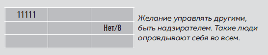 У человека с пятью единицами характер деспота, контролера; если он никак не сглаживается сектором «Долг» (восьмерки), то есть чувством ответственности, то при планомерном стремлении к власти рискует обернуться катастрофой. Поэтому, как ни странно, при всей предрасположенности этого характера к достижению власти таким людям стоит идти в прямо противоположном направлении. Свои лавры ищите в искусстве, творчестве, спорте, там, где можно играть соло, не причиняя вреда людям. Отношение к детям у людей с 11111 очень трепетное и заботливое.