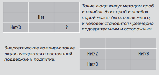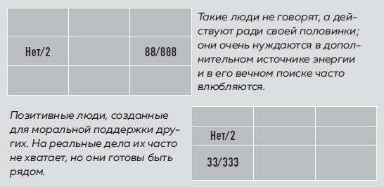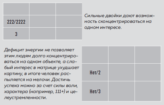 Нет двоек или одна двойка (нет/2)Если в вашей матрице нет двоек, значит, у вас очень мало энергии, вам необходимо подпитывать себя извне. Часто людей с таким сектором энергии называют энергетическими вампирами, так как они невольно стараются зарядиться от других. Это отнюдь не означает, что они хотят причинить людям боль или вред, и тем более не означает, что они это делают. Более того, в стрессе, болезни, несчастьях мы все становимся энергетическими вампирами. Эта ячейка указывает не на количество энергии, а на умение ей распоряжаться, ее расход в той или иной ситуации.