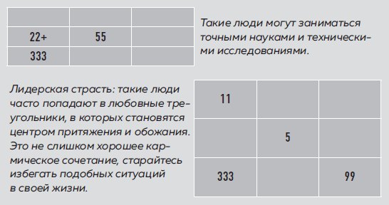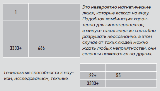 Такие люди могут быть ясновидящими, даже если нет других нужных для этого цифр. Они чувствуют природные катаклизмы и чрезвычайные происшествия. Люди с пятью тройками в этом секторе могут видеть потусторонний мир, например, во снах. Они чрезвычайно быстро развиваются, могут моментально освоить ту или иную сферу, талантливы во всем. Как и людям с 333, им важно реализоваться до 40–50 лет. Среди них много долгожителей.