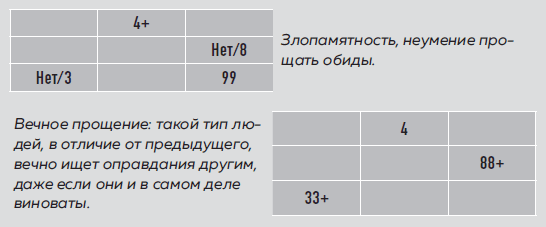 Нет восьмерок или одна восьмеркаУ человека с пустующим сектором «Долг» могут быть проблемы с терпимостью и участием по отношению к другим людям, а также с ответственностью. Исключение – если у них сильный характер (111+). Люди с ослабленным долгом стараются избегать сложностей, болезненно переживают неудачи и на дух не переносят слова «должен» и всего, что с ним связано. Из-за их необязательности часто случаются проблемы и в профессии, и в личных отношениях. Люди с отсутствующей восьмеркой часто понимают, чего от них ждут или требуют, но не хотят это выполнять. Если необходимость потерпеть возникает ради себя любимого, то могут и потерпеть; если же речь идет о том, чтобы проявить терпимость к другим людям, то такой долг в них можно взрастить только родительским воспитанием.