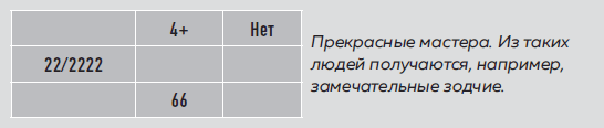 Две шестерки в матрице могут быть показателем настоящего мастера (при наличии 22+), способного создавать шедевры. Причем речь именно об уникальных вещах, а не потоковом производстве. Такие люди очень скрупулезны, внимательны к деталям. В зависимости от других цифр, наполняющих матрицу, им может подходить как мастерство, связанное с тяжелым трудом, так и неэнергозатратные ремесла (ювелирное дело, вязание и т. д.).