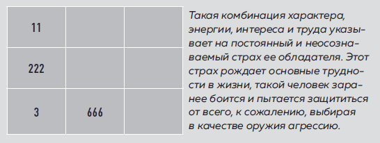 Перегруженная ячейка «Труд» указывает на то, что этому человеку сложно остановиться в своем движении; часто такие показатели называют ведьминскими, хотя это не всегда так. Но важно помнить, что люди с большим количеством шестерок действительно могут влиять на окружающих. Это магическое сочетание, слова и действия таких людей имеют большую энергетическую силу, поэтому они должны быть внимательны, не позволять себе злых мыслей и высказываний в сторону окружающих.