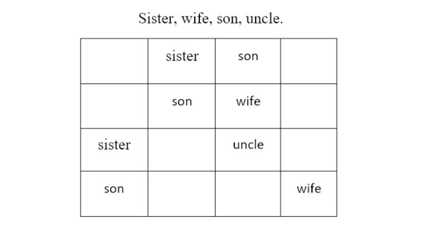 Fill in the blank cells so that the specified words appear in the row and in the column one time. Заполни пустые ячейки так, чтобы указанные слова встречались в строке и в столбце по одному разу.