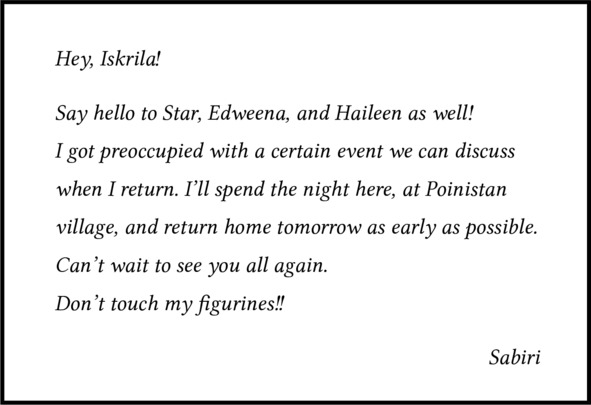 Iskrila made herself stop. Her hand dove into a pocket on her belt and fished out a neatly folded piece of paper. When she finished re-reading Sabiri’s letter for the fifth time today, she was once again smiling, hopeful for a quick reunion. Sabiri would return tired and hungry, so Iskrila decided to cook her something nice beforehand.