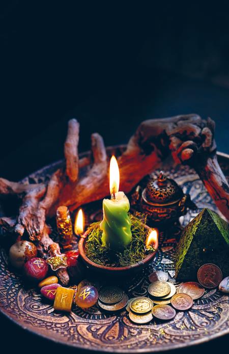 История с украшениями поинтереснее. Многие ведьмы живут по викканскому календарю (так называемое Колесо года) и украшают свой алтарь в соответствии с временем года и ближайшим религиозным праздником на Колесе. Другие организуют священное пространство, почитая определенных религиозных деятелей или духов. Смена времен года для них не столько повод изменить вид алтаря, сколько сигнал, напоминающий о необходимости поддерживать его в чистоте. А некоторые ведьмы вообще его не украшают. Сохраняя чистоту рабочей поверхности, они отказываются от кристаллов, рисунков и трав. Каждая ведьма сама решает, как украсить алтарь и стоит ли в принципе его украшать. Те, кто работает со стихиями, обычно размещают их символы в соответствии со сторонами света:
