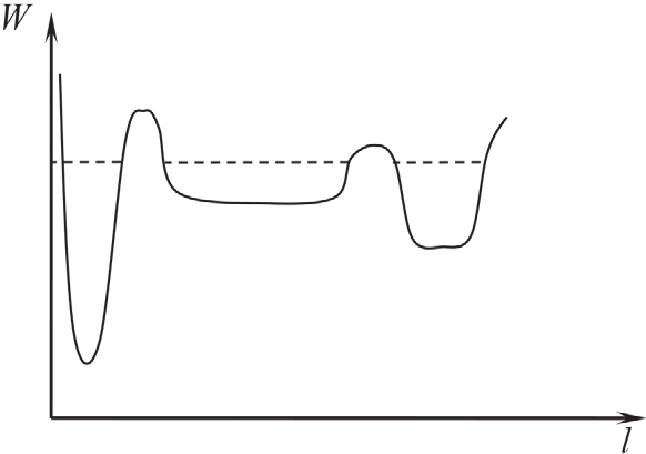 При очень большом количестве шариков необходимо учитывать и заполняемость потенциальных ям. При достаточно больших энергиях флуктуаций и достаточно продолжительном времени их воздействия в этом случае распределение шариков по ямам может приводить просто к закону сообщающихся сосудов. На фигуре 3 пунктирной линией проведён уровень заполненности ям шариками в этом случае.