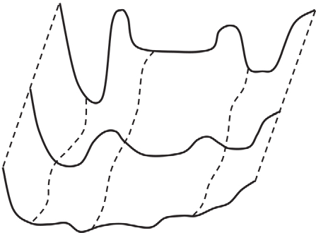 При изменении внешних условий, например, при изменении конфигурации поверхности водоразделов вниз по течению, как показано на фигуре, вероятности попадания в различные потенциальные ямы могут изменяться.