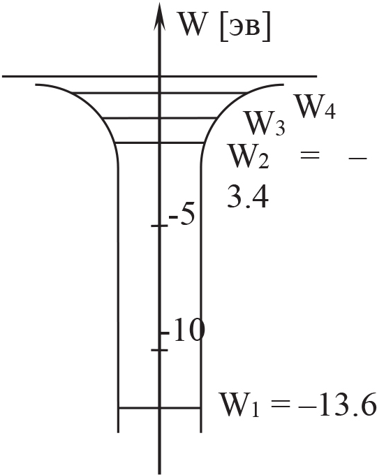При очень большом воздействии окружающей среды какой-либо электрон (находившийся в наименее устойчивом состоянии с относительно большим уровнем энергии) может получить энергию, позволяющую ему покинуть атом. Минимальная такая энергия называется ионизационным потенциалом рассматриваемого атома. На фигуре 5 приведены уровни энергий отдельного атома водорода. В газообразном водороде при комнатной температуре практически все атомы находятся в основном состоянии, а электроны находятся на оболочке с уровнем энергии – 13,6 эв. Если этот газ нагреть достаточно сильно, то некоторые атомы, сталкиваясь между собой, уже смогут приобрести кинетическую энергию, превышающую 10,2 эв. Электрон перейдёт с низшего уровня на более высокие. Наличие вакантного места на оболочке первого уровня заставит электрон, испустив соответствующий фотон или фотоны, вернуться в прежнее состояние.