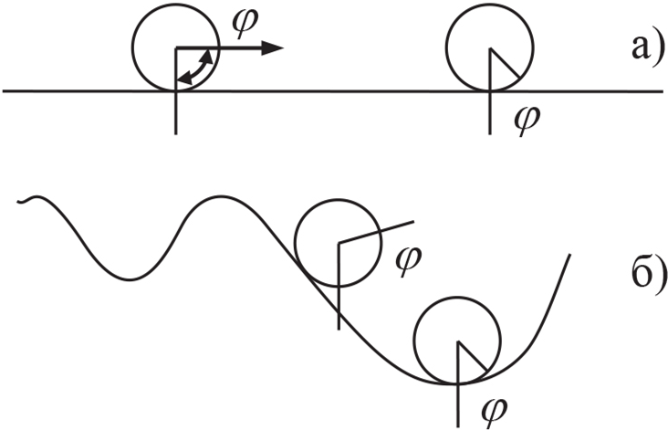 Лабильность объектов связана с достаточной малостью барьеров, отделяющих одно относительно устойчивое состояние от другого, а в предельном случае – достаточно большим пространством, в котором эффективность относительной устойчивости не зависит от каких-либо факторов. Ярким примером такого безразличного отношения к одному из факторов является отношение относительно устойчивых состояний вышерассмотренного шарика, находящегося на горизонтальной поверхности. Расстояние от центра шарика до центра притяжения Земли постоянно и не зависит от угла φ и предопределяет безразлично равновесное, относительно устойчивое положение шарика на поверхности (фигура 7а). Изменение угла φ под действием малых возмущений не изменяет эффективности относительно устойчивого положения шарика. В случае с достаточно большими энергетическими барьерами между относительно устойчивыми состояниями при малом изменении угла φ положение шарика в потенциальной яме изменяется. Из-за высокого барьера шарик остаётся в той же яме, но его положение устойчиво только при одном значении φ. В этом случае лабильность по φ теряется.