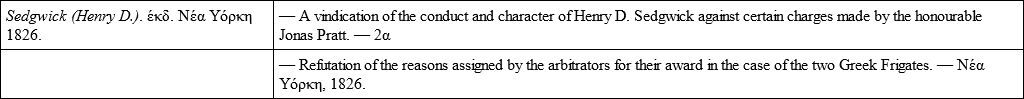 Contostavlos (Α.). – A narrative of the material facts in relation with the building of the two frigates – α' έκδ. Νέα Υόρκη. 1826· β' έκδ. with a postcriptum by R. Sedgwick, αυτό έτος.