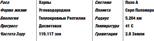 Он не думал, что в переговорах с Харпами возникнут сложности – он знал их язык, и они были достаточно биологически близки к Аэру. Харпы были высшими рептилиями, около двух с половиной метров ростом, передвигались на двух ногах и имели две руки, в точности, как Аэру. Тело было полностью покрыто прочными пластинами, на вытянутой голове находился всего один глаз, видимых органов обоняния и слуха не было заметно, а изо рта торчали длинные зубы. Это была агрессивная раса, выросшая и добившаяся господства в суровом мире вечной пустыни, – у них с Аэру было гораздо больше общего, чем, например, с Синуке Хранителями.