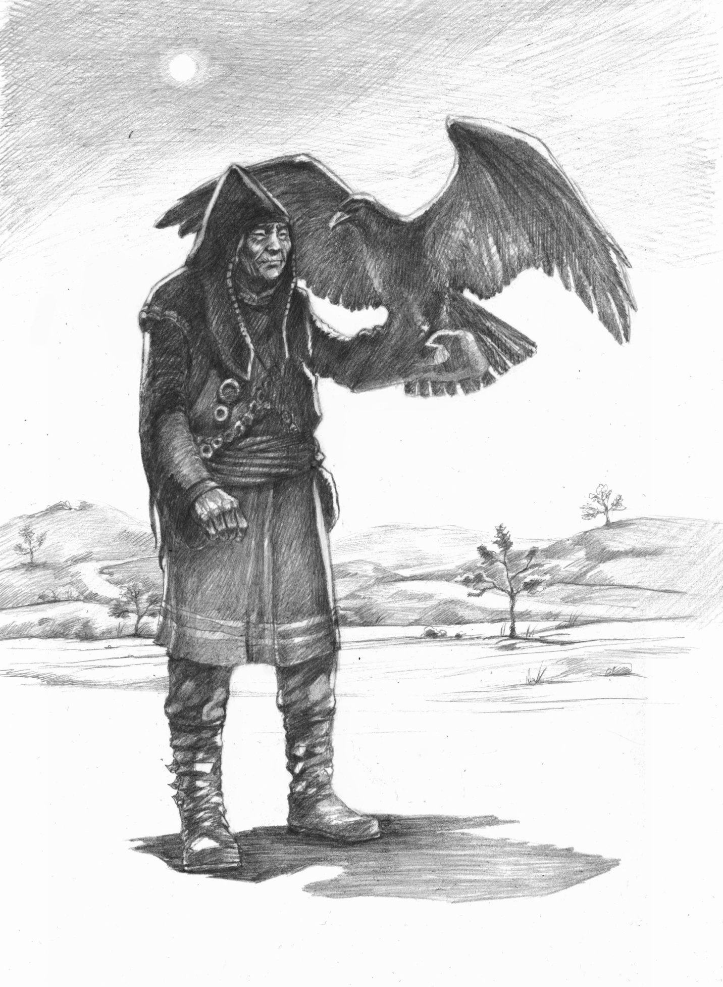 Человек подошёл к убитому зайцу, присел на одно колено и откинул накидку, закрывающую лицо от слепящего солнца. Взору явилось худое морщинистое волевое лицо седой женщины. Старуха подняла голову кверху и свистом позвала беркута. Ловкими и уверенными сильными движениями она вспорола зайцу живот и выпотрошила все внутренности на землю.