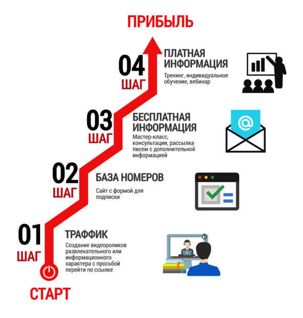 По канонам инфобизнеса прибыль можно получить за 4 шага: наладить траффик, собрать базу с контактами заинтересовавшихся, дать потенциальным клиентам бесплатную информацию, предложить им платные услуги или продукты.