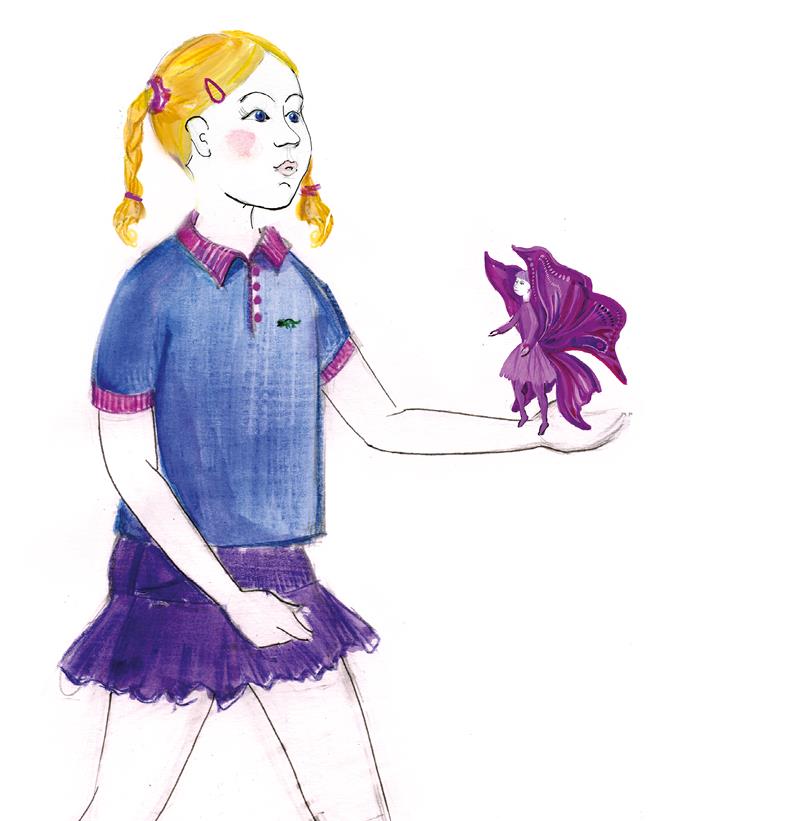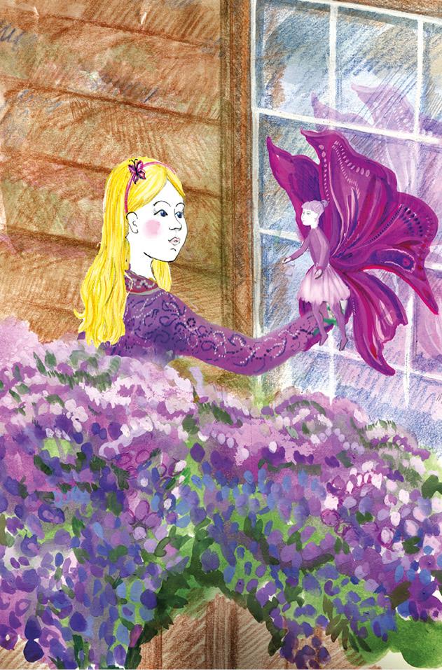 «Что ты смотришь по сторонам? Я внутри твоего ужасного сачка». Кайса не могла поверить, неужели это бабочка с ней говорит. Она быстро перекинула её в банку, захлопнула крышку и начала разглядывать содержимое банки. Там Кайса увидела крошечную девочку с большими лиловыми крыльями.