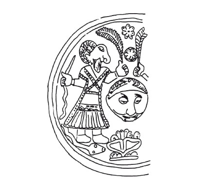Иногда на монетах слон изображался с колокольчиком на шее – как на «тройной бронзе» Деметрия I, и при этом хобот слона изогнут точно так же, как и на слоновьем головном уборе, о котором говорилось выше (ил. 45, Попов, 2008: 127). То же можно видеть и на монетах первого индоскифского царя по имени Мауэс, или Май (ок. 85–60 до н. э.): голова слона с колокольчиком на шее и изогнутый хобот в виде все той же латинской «s», как на головном уборе Деметрия (Plate III, ил. 4; Brown, 1922). Возможно, на этих трех монетах изображен один и тот же слон – старый слон Такшашилы, где в древности мог существовать культ слона, запечатленный на монетах Деметрия и Аполлодота.