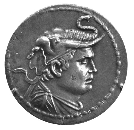 Позже именно такой головной убор в виде головы слона с поднятым хоботом хорошо был известен и в романском искусстве – это так называемый proboscis, или exuviae elephantis. Его можно увидеть на монетах древнеримского военачальника и политического деятеля Метелла Сципиона. На сципионовых монетах кончик слоновьего хобота, изгибаясь, опускается вниз и орошает растение. Этот головной убор был своего рода символом Александрии, а затем и римской провинции Африка. Такие монеты чеканились в 47–46 гг. до н. э.