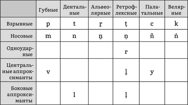 В тамильском языке есть краткие и долгие гласные, а также два дифтонга: a – ā; i – ī; u – ū; e – ē; o – ō; ai; au. Глухие и звонкие согласные фонологически не различаются; звонкость зависит от положения согласного в слове.