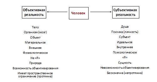 Суть психофизических противоречий заключается в особенностях пространственного ограничения объективной и субъективной реальности, полярности их характеристик и возможности/невозможности объективирования (рис. 3).