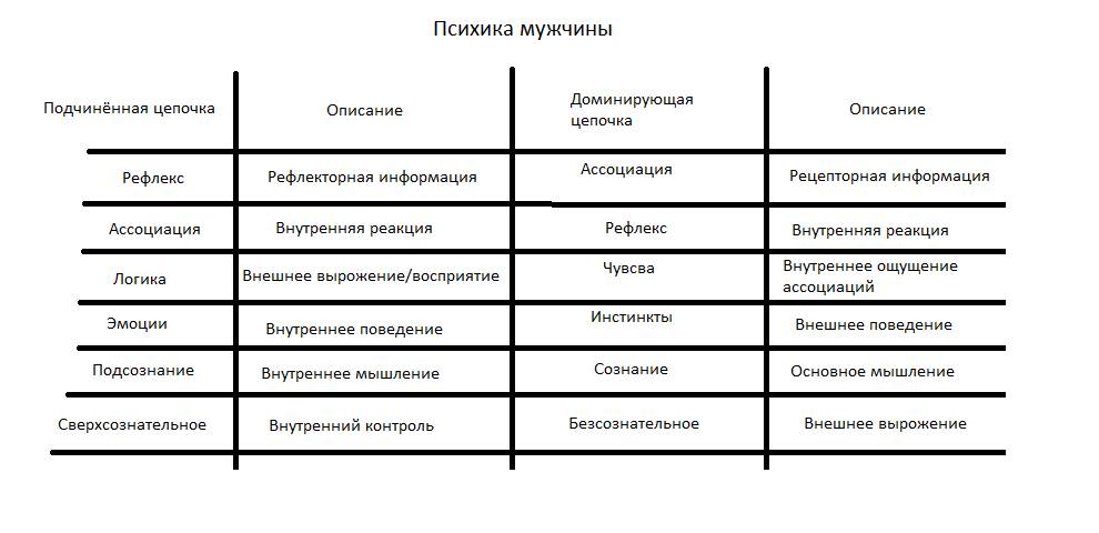 Какие типы среды существуют и как в них происходит информационный обмен. Существует два уровня взаимодействия психических цепочек, внутри организма и снаружи. Внутренняя среда у мужчин – это ассоциативный тип подчиняющий рефлекторный, другими словами мужчины мыслят ассоциативно выражаясь рефлекторно. Получается, что в мужском организме доминирует вторая психическая цепочка, которая подчиняет себе первую, давайте разберемся, как это происходит. Мужчина мыслит ассоциациями, которые формируют соответственные рефлексы, эти рефлексы порождают чувства, благотворя этим чувствам мужчина способен ощущать ассоциации, другими словами чувствовать ассоциативный момент или ассоциативное решение. Чувства формируют инстинктивную базу данных, благодаря которой формируется инстинктивное поведение мужчины, которое формирует сознание или проще говоря сознательное мышление. Сознательное мышление у мужчин основывается на ассоциативном опыте инстинктивных решений, сознание, как бы говорит нужно сделать, что-то чувственно выбирая варианты ассоциативного типа. Помимо этого, сознательная деятельность вызывает рефлекторное поведение организма в виде бессознательного, которое формирует мимику жесты и позы мужчины. Первая цепочка мужчин является подчиненной которая формируется исходя из рефлексов которые формируют ассоциации благодаря чему формируется логика. Так как цепочка подчинённая мужчины хорошо оперирует логикой, выражая ее при помощи ассоциаций, логика формирует эмоции, как результат реакции на нее, так как эмоции это ассоциативный тип мужчина хорошо воспринимает эмоции из вне и понимает собственные на уровне логического восприятия. Эмоциональное поведение формирует подсознательную деятельность или грубо говоря рефлекторное мышление, так как рефлекторное мышление – это подсознание, а как мы знаем подсознание подчиняется сознанию, то это подтверждает, что вторая цепочка у мужчин доминирует над первой, также как сознание доминирует над подсознанием вызывая рефлекторное мышление ассоциативным способом. Управление подсознанием происходящее сознательным путем при полном контроле организма вызывает сверхсознательное состояние, которое позволяет мужчине подчинить себе весь организм при мощи сверхсознательного управления ассоциациями, принимать решения, ощущая не только ассоциативный тип, но и рефлекторный как подчинённый, что открывает возможности коллективных взаимодействий практически сознательным путем. Получается, что мужчины мыслят ассоциативно, а выражаются рефлекторно, также ощущают внутреннюю среду ассоциативно (чувственно), а внешнюю рефлекторно бессознательно. Данный вывод строения психики мужчины описан мной в рамках данной теории и подтверждается не только логическими умозаключениям, но и личными ощущениями, исходя из имеющегося опыта психического управления организмом.