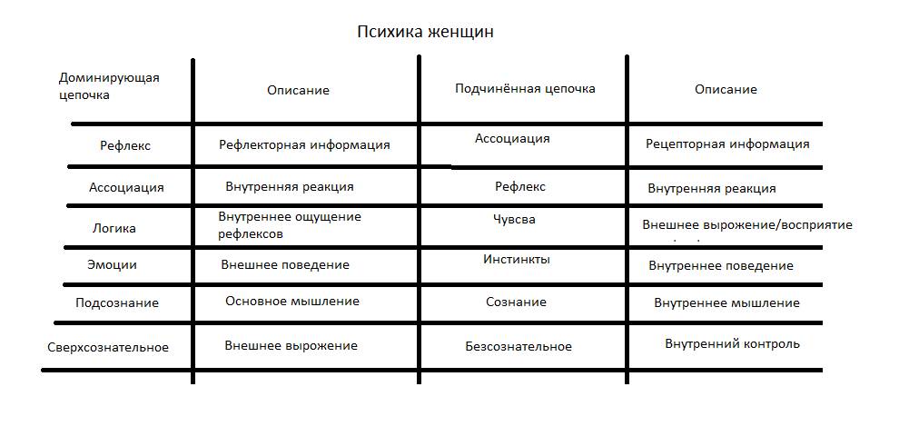 Это касается мужчин, если рассматривать женщин, то давайте попробуем описать женскую психику согласно данной теории. У женщин доминируют эмоции, которые вызывают логику как средства выражения эмоций, согласно этому, можно сделать вывод что женщины мыслят рефлекторно, выражаясь ассоциативно на сверхсознательном уровне в следствии чего делаю вывод, что у женщин доминирует первая цепочка, а вторая является подчинённой. Давайте разберёмся в этом по подробнее. Так как у женщин доминирует рефлекторная цепочка то они воспринимают внутреннюю информацию логически т.е. рефлекторно, рефлексы порождают ассоциацию, а ассоциация порождает логику, которая формирует эмоциональную базу данных, эмоциональное поведение формирует подсознательное мышление, из чего можно сделать вывод что женщины мыслят рефлекторно т.е. при помощи мышечного мышления чувствуя эмоционально, а выражают внутренний мир логически. Получается, что мыслительная системы женщины основывается на подсознательном (рефлекторном) мышлении. Получается, что сверхсознательное состояние у женщин позволяет им выражать рецепторное возбуждение, вытекающее из подсознательного мышления ассоциативным способом т.е. у мужчин сверхсознательное это сверх контроль внутренней среды организма при помощи ассоциаций, а у женщин это способность выразить подсознание ассоциативным способом, как сверх контроль внешнего. Это, как ассоциативное выражение через мимику, жесты и позы только сознательным путем т.е. сверхсознательные манипуляции. Вторая цепочка у женщин подчинённая внешние ассоциации порождает рефлексы, которые вызывают чувственное восприятие внешней среды т.е. через логику они ощущают внутренний мир, а через чувства внешний, чувства порождают инстинктивное поведение внутренней среды, а эмоции используются для внешнего выражения внутренней среды, инстинкты формируют сознание, которое у женщин является подчинённым подсознанию и выполняет функцию внутреннего мышления. Сознание у женщин как подсознание у мужчин создано, как внутренне мышление т.е. у женщин внутренне мышление ассоциативного типа. Сознание порождает бессознательное как результат их чувственных ощущений внешнего мира.