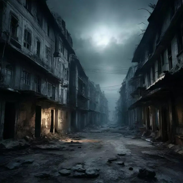 Силуэты обветшалых фасадов зданий кажутся призраками из прошлого, напоминая о временах, когда на улицах царила беззаботная жизнь, и стоял радостный шум ночных забав.