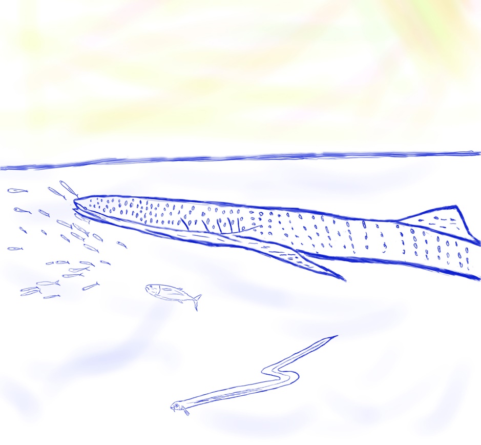 Мимо проплывает длинная, метров 8—9 рыба, шириной около 60 см, полупрозрачная частично. С любопытством изучаем друг друга.