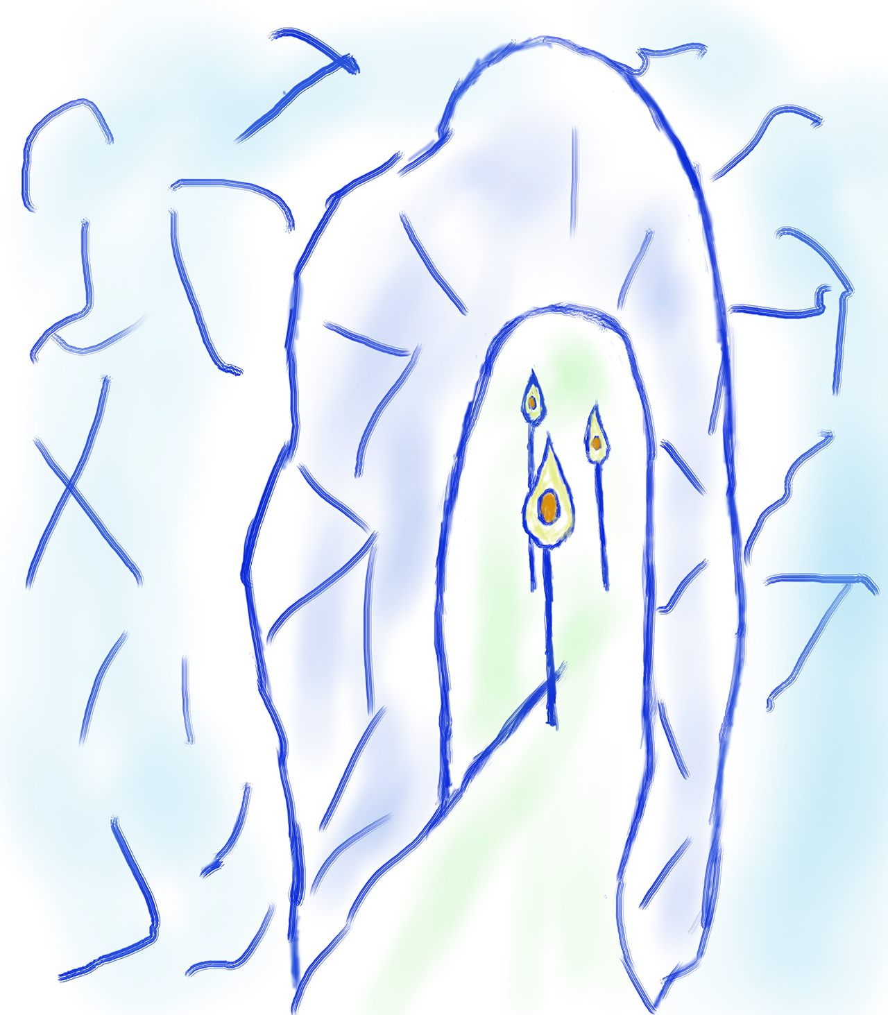 Замечаю движение каких-то энергетических существ на входе в пещеру. Приближаюсь. По форме это спичка с каплей коричневой в виде одного глаза, высотой чуть меньше моего роста, толщиной с палец человека. Голова в виде капли вытянутой, размером с кулак и коричневым глазом размером 1/3 головы, расположенным внутри этой капли. Трое существ парят на высоте 2—3 см над поверхностью, изучив меня – следуют вглубь. Направляюсь за ними по пещере, они проходят в дверь, которая вдоль оси прокрутилась и закрылась передо мной, слившись со скалой. Я прохожу прямо по сквозному туннелю.