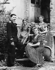 Семья Дедовых во дворе дома: дядя Петя, Таня, Сашка, Рита, тётя Кира. 1951 год