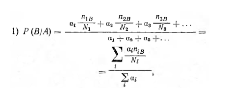В величину вероятностного прогноза события В при условии, что непосредственно перед тем было А, входят: доля карточек В среди первых N1 карточек в ящике А с коэффициентом а1, доля карточек В среди следующих N2 карточек в ящике А с коэффициентом а2, доля карточек В среди следующих N3 карточек в ящике А с коэффициентом а3 и т. д. Вероятность того, что наступит событие В при условии, что произошло событие А, будет такой: