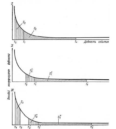 На оси ординат – весовой коэффициент давности, на оси абсцисс – давность событий: I – кратковременный недавний опыт «перевешивает» более длительный, но давний; II – по прошествии некоторого времени этот «перевес» утрачивается; III – повторное обучение требует меньше времени, чем первоначальное