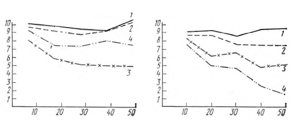 На рисунке 8 показано, что разность между амплитудой импульсов на ЭМГ правой и левой рук уменьшается к концу опыта до 1–2 мкв в серии А и увеличивается в среднем до 6 мкв в серии В в пользу работающей руки. В серии В после первого десятка сигналов все значения разности (кроме одного) расположены выше нуля.