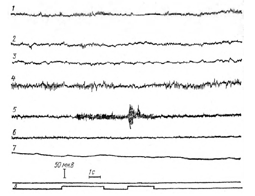 Опыты проводились в условиях стандартной процедуры электроэнцефалографического исследования. Регистрировались депрессия доминирующего ритма на ЭЭГ и КГР по Тарханову. Звуковыми сигналами служили громкие тоны от звукового генератора (от 600 до 1000 Гц); звуковые раздражители подбирались таким образом, что не вызывали трудности различения. Каждая серия раздражителей состояла из пяти сигналов – вспышка («внимание») и четыре звуковых тона, которые обозначим цифрами I, II, III и IV. Интервалы между сигналами внутри серии варьировались от 5 до 15 с и около 20 с между сериями. В некоторых случаях четвертый звук отличался от предыдущих, что не повлияло на характер реакций испытуемого.