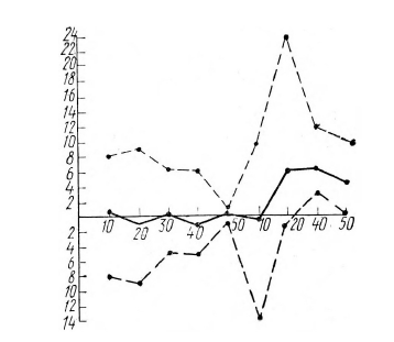 По вертикали отложена величина разности в мкв, по горизонтали – номера сигналов. Приведены величины по десяткам сигналов. Первые 50 сигналов – серия А, вторые 50 – серия В. Разность в мкв в пользу правой (серия А) и «работающей» (серия В) руки отложена выше средней линии, разность в мкв в пользу левой и «неработающей» руки отложена ниже средней линии. Сплошная линия – среднее арифметическое разности по всем испытуемым (с учетом знака разности: выше нуля – плюс, ниже нуля – минус), прерывистая линия – максимальное значение разности по всем испытуемым