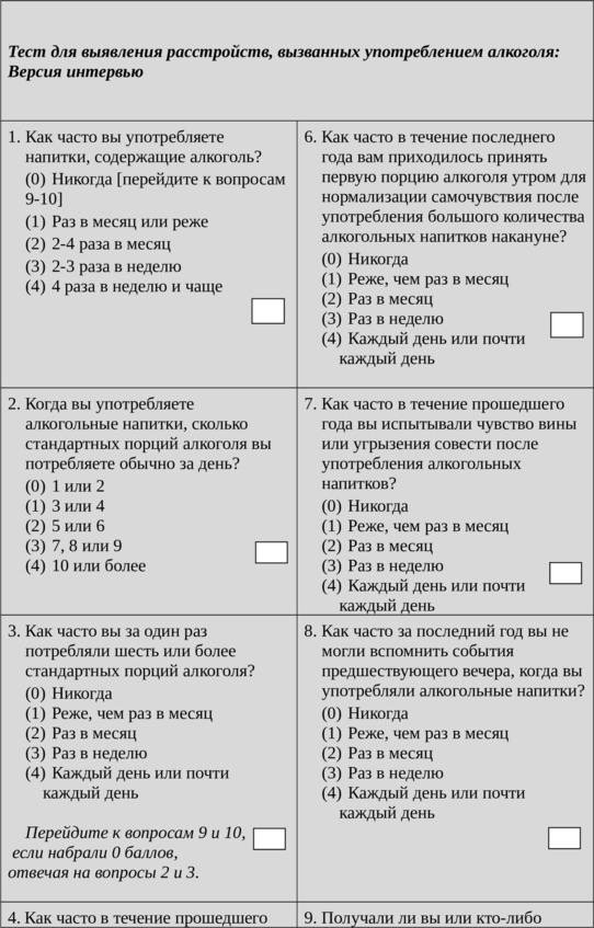 Для уточнения категории ответа принято считать, что одна порция алкогольного напитка равна 10 граммам чистого спирта. В странах, где содержания алкоголя в стандартном напитке отличается от 10 грамм более чем на 25%, категории ответов следует соответствующим образом модифицировать».