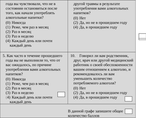 Рекомендуемый пороговый балл – 8. Люди с баллом больше 15, скорее всего, отвечают критериям имеющейся в настоящее время алкогольной зависимости.