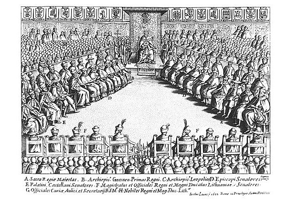 На первом плане автор гравюры, являясь одним из приглашенных участников заседаний Сейма, поместил «сидящих в креслах» Сенаторов – «Magistratus et Officiales Regni et Magni Ducatus Lithuaniae, Senatores». Видно, что великокняжеские представители из Литвы занимали достойное место в этом «объединённом парламенте», с одной стороны, и громадное количество всех остальных, посланников, послов и других представителей федеративного государства Речи Посполитой.