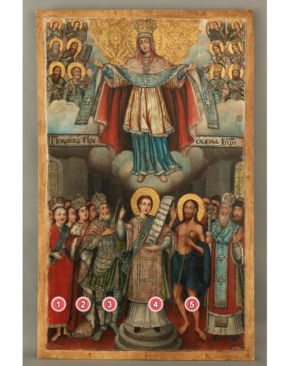 Это, так сказать, классический сюжет любой иконы «Покрова Богоматери». Но беларуские иконы всегда имеют свои характерные особенности.