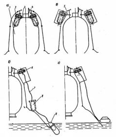 Размещение спасательных плотов и этапы их приготовления к использованию: а – походное положение контейнеров; б – контейнеры с плотами отвалены; в – нижняя часть контейнера с плотом сброшена в воду; г – плот в рабочем положении.