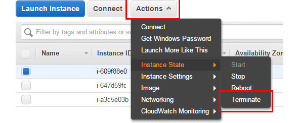 – Вернувшись в консоль EC2, отметьте созданный инстанс. Затем нажмите Actions, перейдите к пункту Instance State и выберите Terminate (рисунок 99)