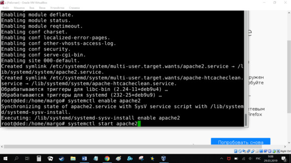 Затем разрешим запуск служб apache2 при запуске системы командами листинга 8, что представленно на рисунке 80. Это необходимо для того, чтобы при включении компьютера не запускать веб-сервер apache вручную.