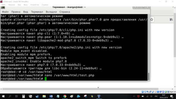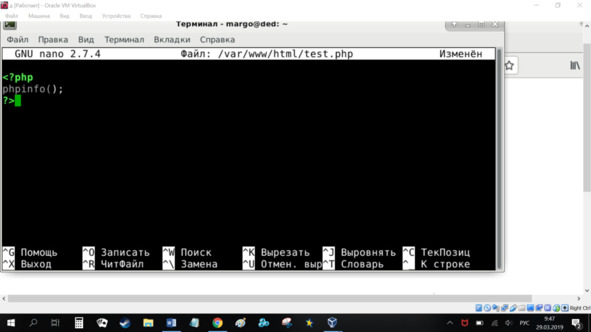 Чтобы проверить, что установка PHP прошла успешно, создадим файл «test.php» в каталоге «/var/www/html/» командой листинга 10, как на рисунке 83.