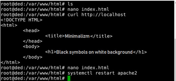 Далее создадим и заполним файл «index.html» в каталоге «/var/www/html/» исходным кодом интернет-страницы командой листинга 12 и сохраним, что представлено на рисунке 86.