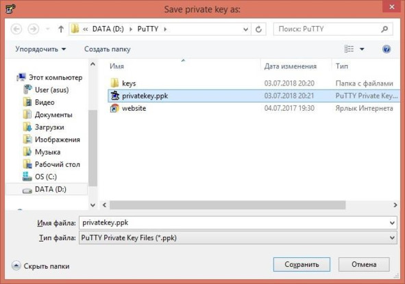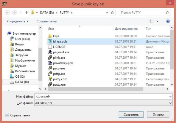 4) Сохраняем публичный и приватный ключи в папку с инструментами PuTTY под именами id_rsa. pub (рис. 11) и privatekey. ppk (рис. 12)