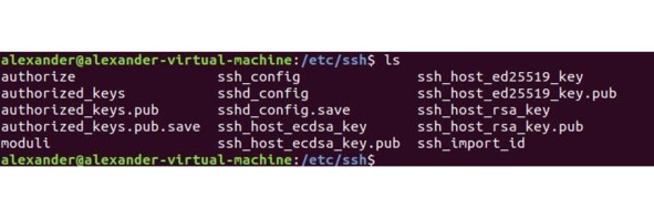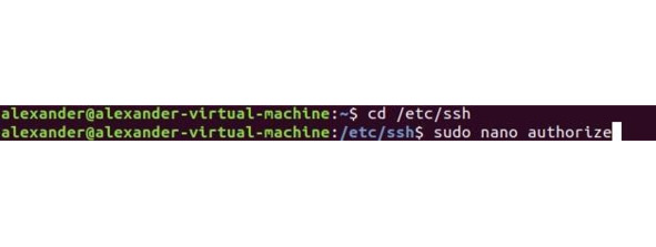 2) По адресу в настройках сервера создаем и открываем файл с авторизированными ключами командами «cd /etc/ssh», «sudo nano authorize» (рисунок 19);