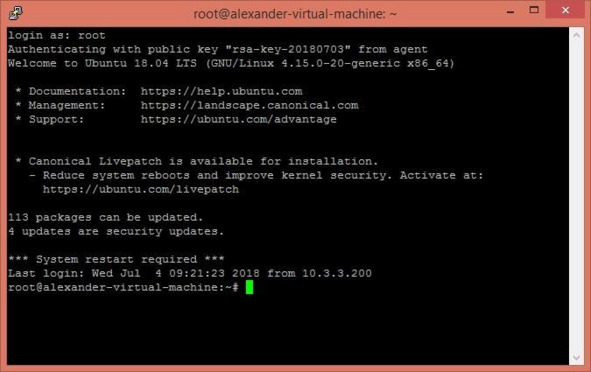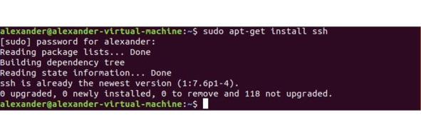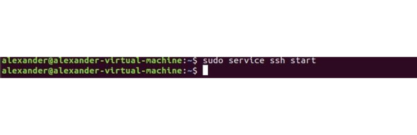 Для установки SSH сервера требуется:1) Установить виртуальную машину с Ubuntu.2) Открыть терминал (Рисунок 1);3) Прописать команду sudo apt-get install ssh (Рисунок 2) Ввести пароль sudo если потребуется;4) Для запуска сервиса используется sudo service ssh start (Рисунок 3)
