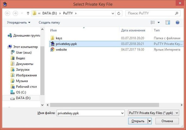 2) Добавляем приватный ключ privatekey. ppk (рисунок 23)